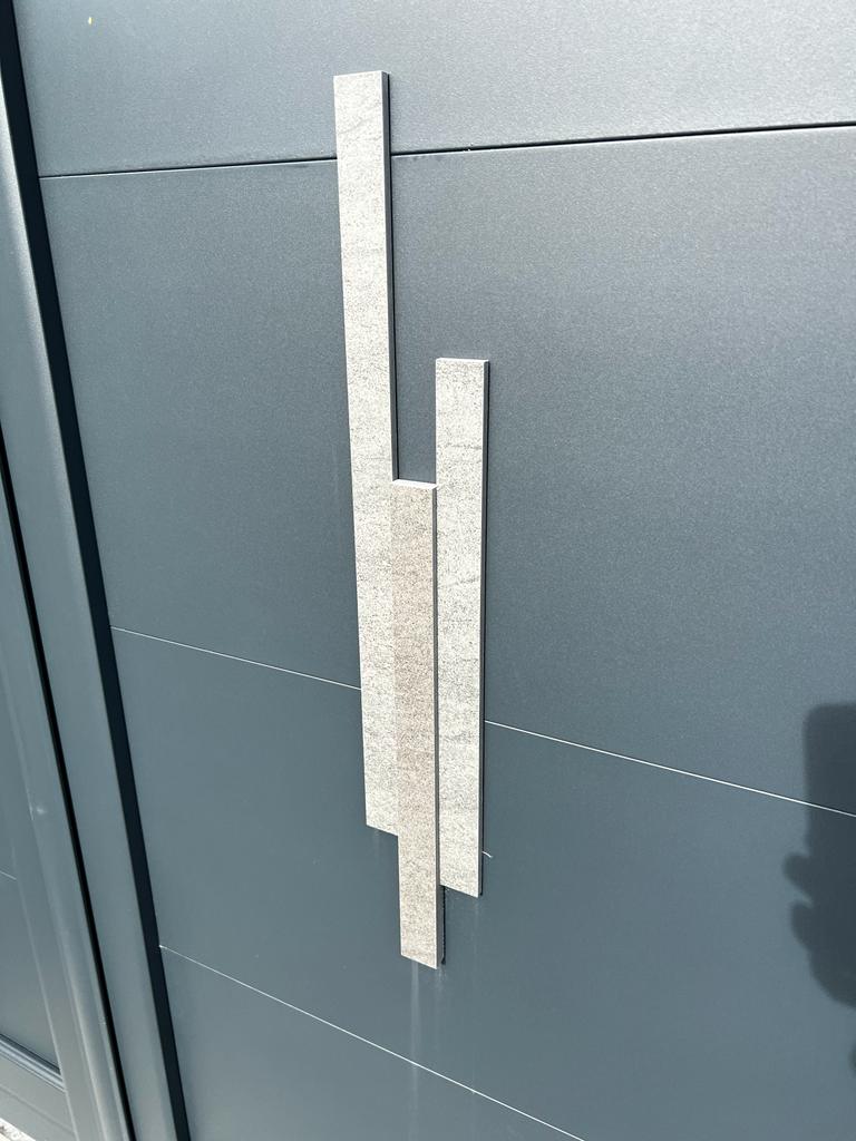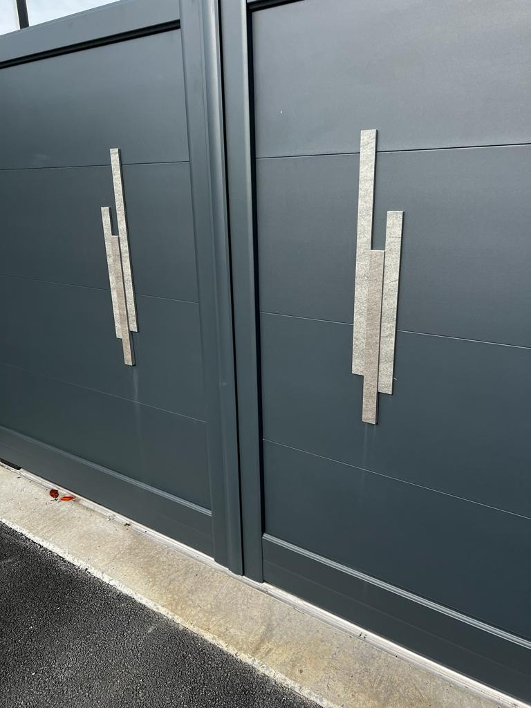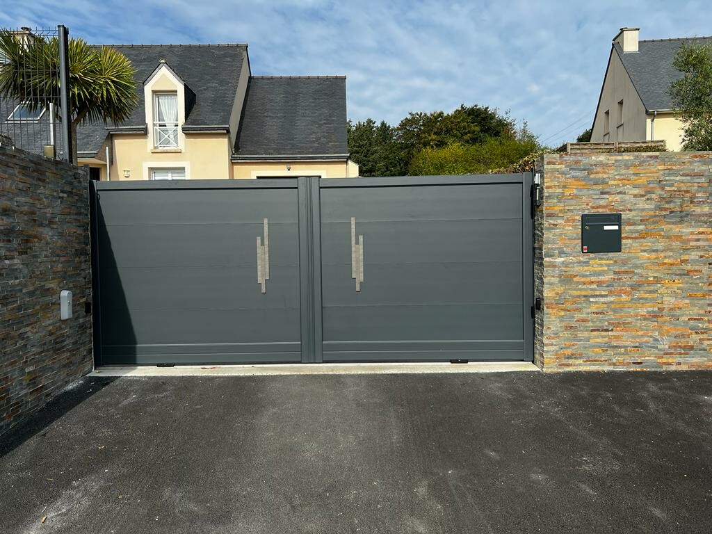 Mise en place d'un portail de clôture en aluminium du modèle "Opale" à Morieux. Le design est rehaussé par des inserts céramiques extérieurs, tout en conservant une finition moderne avec un coloris gris 7016. Le portail bénéficie également d'une motorisation fiable fournie par DEA.